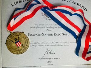 Madina’s Member of Parliament, Honorable Francis-Xavier Sosu, has once again made Ghana proud, receiving the esteemed U.S. Presidential Lifetime Achievement Award for Voluntary Service in recognition of his extraordinary advocacy and service to humanity.
