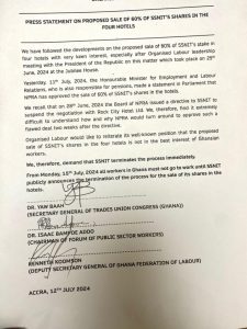 Addressing the media on July 12, Dr Baah said “From Monday 15 of July 2024, all workers in Ghana must not go to work until SSNIT publicly announces the termination of the process for the sale of its shares in the hotels.”