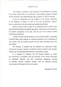 “It must be emphasized that the Embassy of the Russian Federation in the Republic of Ghana, as well as the other government agencies, have no connections to the abovementioned unauthorized gathering,” the embassy said. “Moreover, upon receipt in August of information about a public action being plotted, the Embassy immediately appealed to Ghana Police and warned about the possible organization of the rally with the use of the national symbols of the Russian Federation.