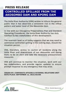 The Volta River Authority (VRA) has cautioned residents downstream of Akosombo and Kpong dams to be alert and take precautionary measures following a controlled spillage in the coming days.
